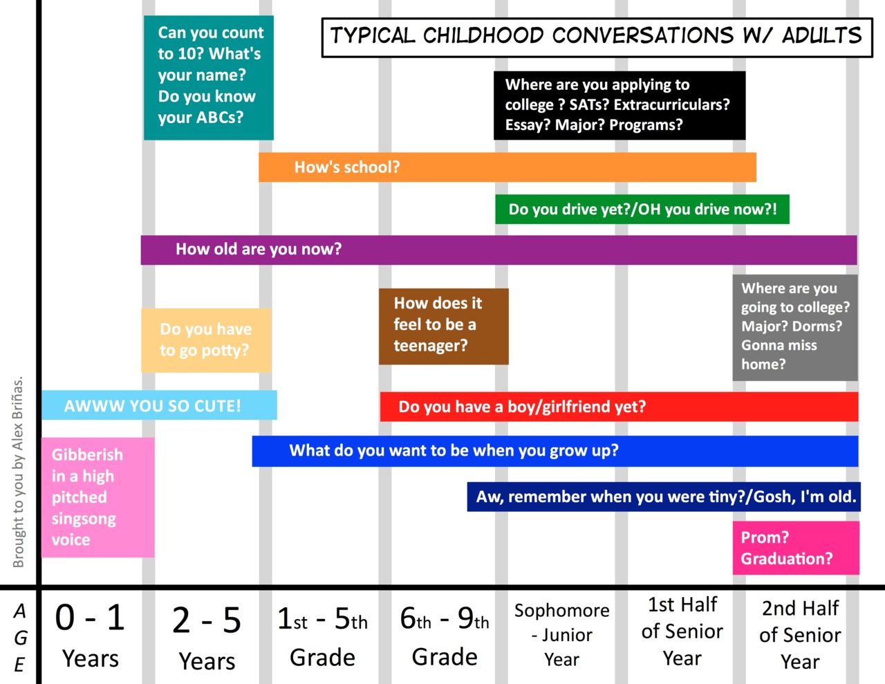 What kind of conversations are the most common between adults and children? Here is a graphic that shows the types of questions asked at what ages. Interesting. As a father of young children and a full time youth worker, I simultaneously see both ends of the spectrum. I’d say in an over-generalized kind of way, it is pretty much right on.