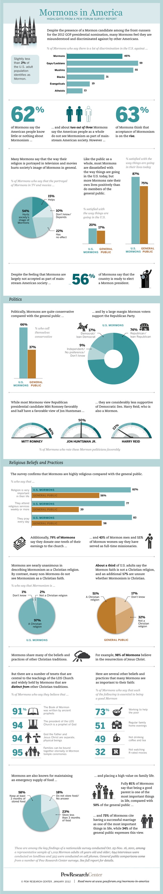 In light of the front running presidential candidate, Mitt Romney, being Mormon, I thought I’d post this informative graphic that really puts some numbers behind this religion. While less than 2% of America identifies themselves as Mormon, their presence and influence is surly on the rise.